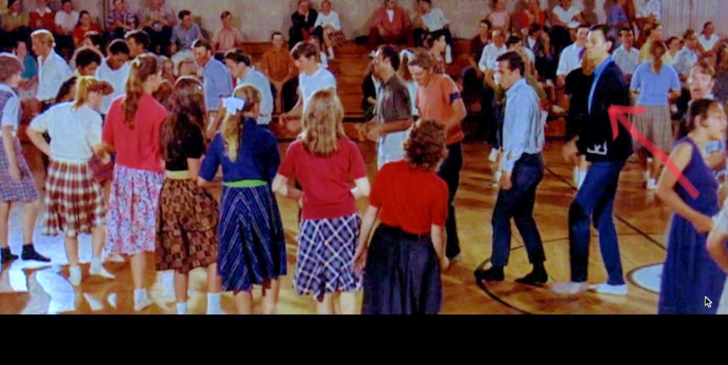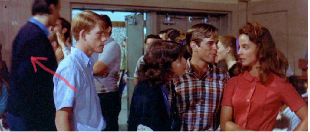 We had to get waivers and permission slips signed. There were about seven of us from Novato High School who signed up. It was a one-day filming at the gym in Mill Valley, Tamalpais High School. We arrived, and there was an abundance of high school kids there anxious to start their movie careers as extras. We were instructed how to dress for the event. First, barber chairs were set up, and all us boys who had 70’s hair were reduced to 60’s hair. I even was left with a ducktail. I was wearing my father’s dark blue letterman sweater with the letter “H” (Hill Jr. High) sewn onto it by my mother. It does help identify me in the movie, besides being a 6’6″ 15-year-old.